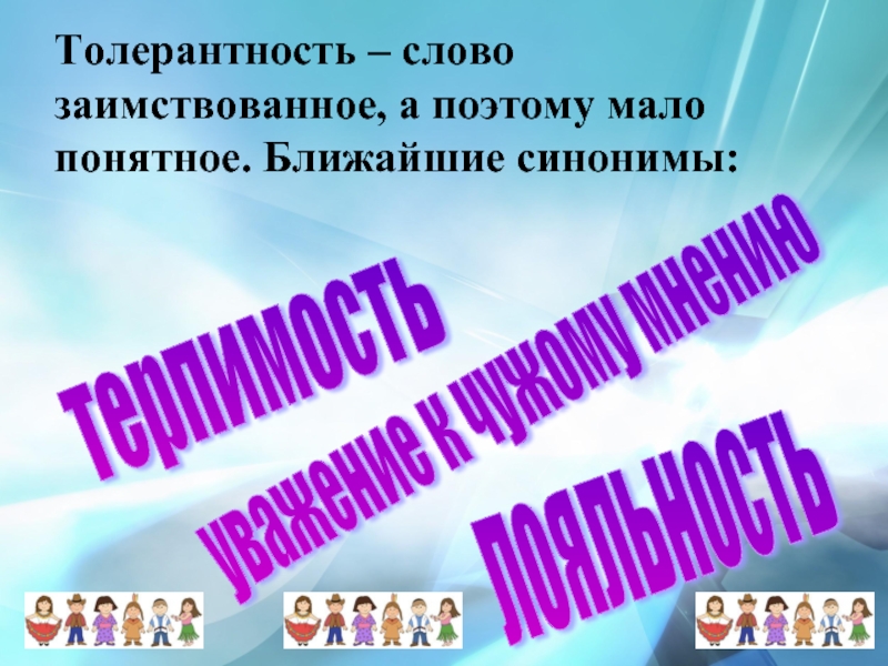 Быть толерантным – означает «позволять, допускать, проявлять великодушие в отношении других». (в китайском языке)