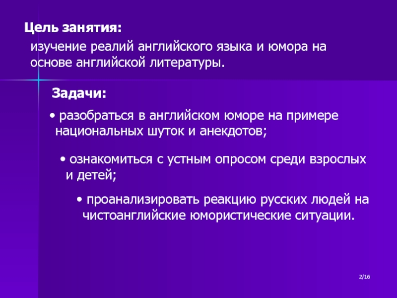 разобраться в английском юморе на примере национальных шуток и анекдотов;