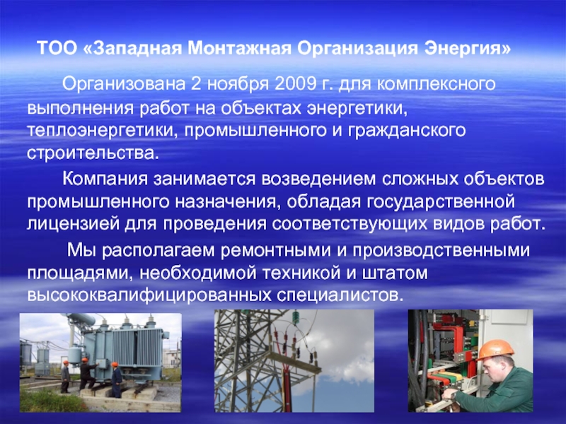 2009 г. для комплексного выполнения работ на объектах энергетики, теплоэнергетики, промышленного и гражданского строительства.