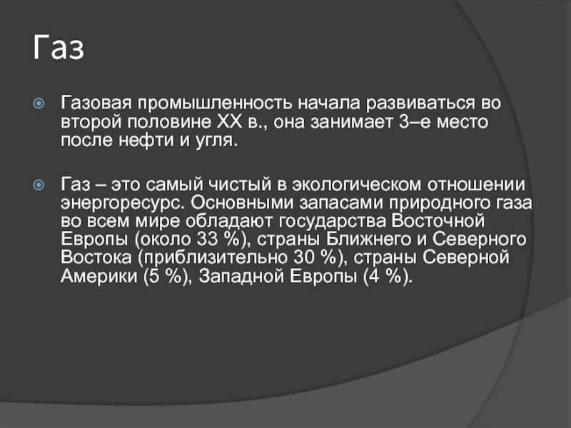 Газ – это самый чистый в экологическом отношении энергоресурс. Основными запасами природного газа во всем мире обладают государства Восточной Европы (около 33 %), страны Ближнего и Северного Востока (приблизительно 30 %), страны Северной Америки (5 %), Западной Европы (4 %).