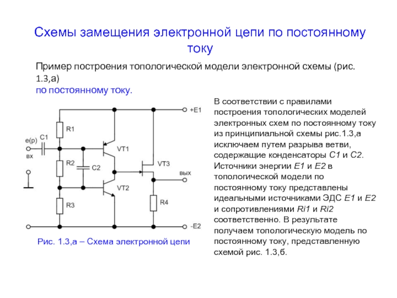 При анализе линейных непрерывных электронных схем наиболее известным приемом упрощения является составление нескольких топологических моделей исследуемой цепи: топологической модели по постоянному току и топологической модели по переменному току.