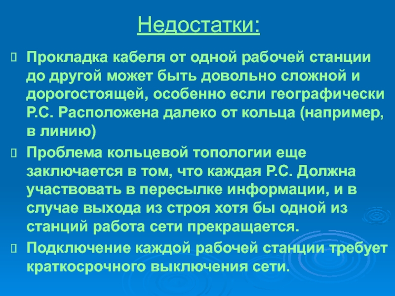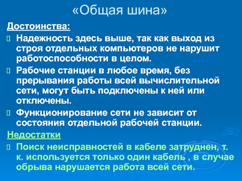Поиск неисправностей в кабеле затруднен, т.к. используется только один кабель , в случае обрыва нарушается работа всей сети.