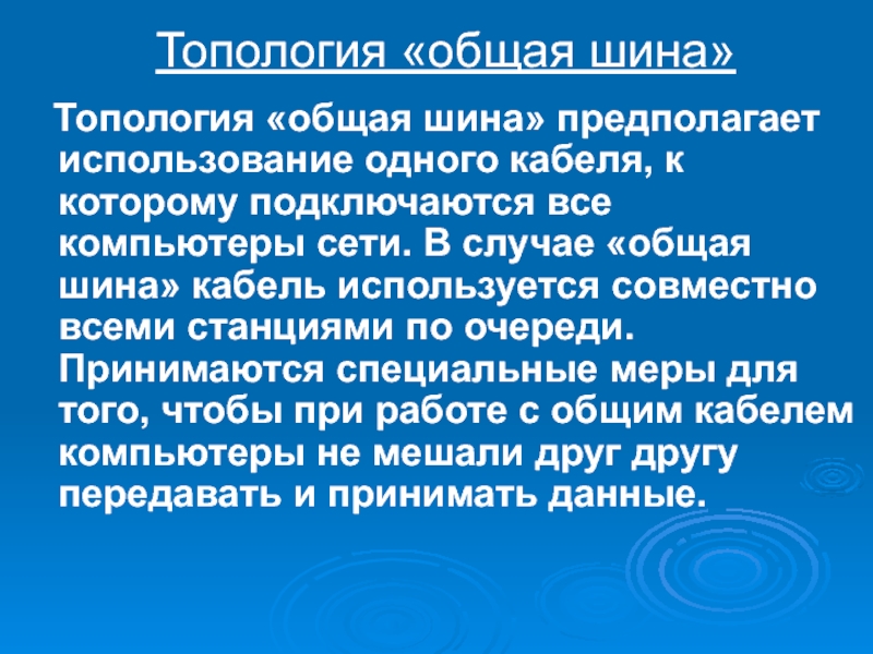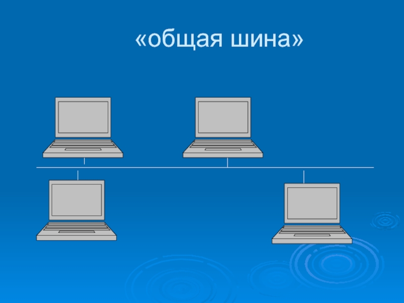 к которому подключаются все компьютеры сети. В случае «общая шина» кабель используется совместно всеми станциями по очереди. Принимаются специальные меры для того, чтобы при работе с общим кабелем компьютеры не мешали друг другу передавать и принимать данные.