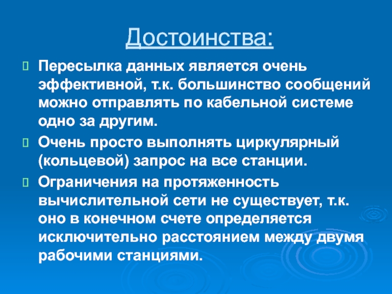 Проблема кольцевой топологии еще заключается в том, что каждая Р.С. Должна участвовать в пересылке информации, и в случае выхода из строя хотя бы одной из станций работа сети прекращается.