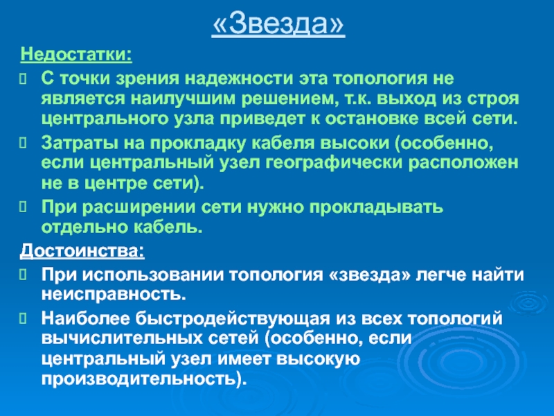 Наиболее быстродействующая из всех топологий вычислительных сетей (особенно, если центральный узел имеет высокую производительность).
