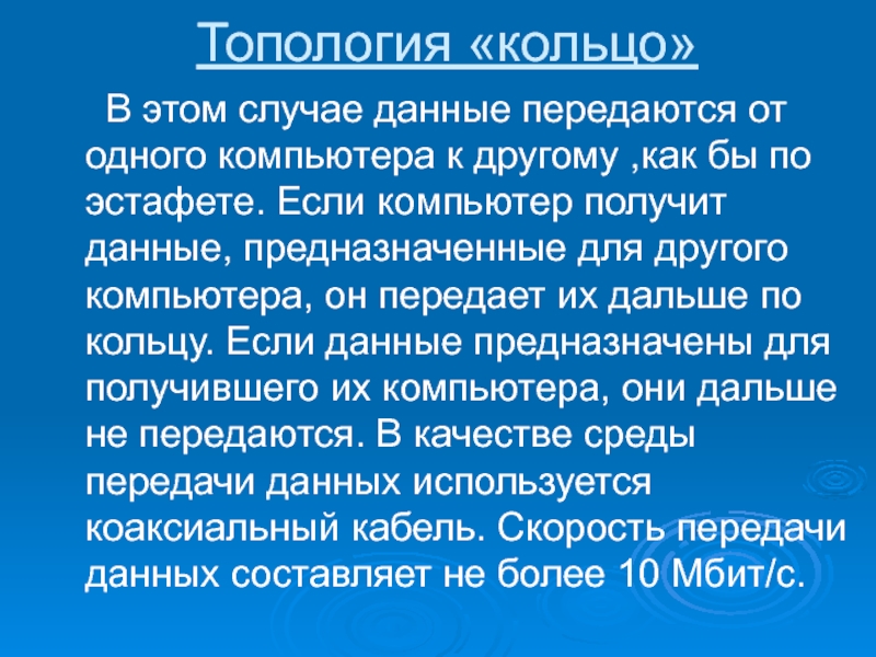 компьютера к другому ,как бы по эстафете. Если компьютер получит данные, предназначенные для другого компьютера, он передает их дальше по кольцу. Если данные предназначены для получившего их компьютера, они дальше не передаются. В качестве среды передачи данных используется коаксиальный кабель. Скорость передачи данных составляет не более 10 Мбит/с.