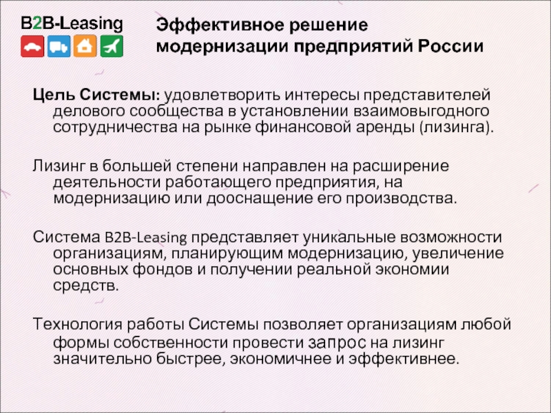 B2B-Leasing – это 8 лет опыта в лизинге. Это не просто Система в сети Интернет. Это опытные специалисты. Мы занимаемся продажей лизинговых услуг – Поставщики увеличивают продажи техники и оборудования.