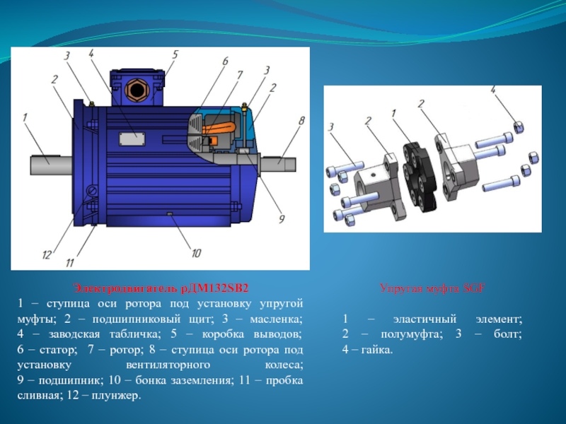 – подшипниковый щит; 3 – масленка; 4 – заводская табличка; 5 – коробка выводов; 6 – статор; 7 – ротор; 8 – ступица оси ротора под установку вентиляторного колеса; 9 – подшипник; 10 – бонка заземления; 11 – пробка сливная; 12 – плунжер.