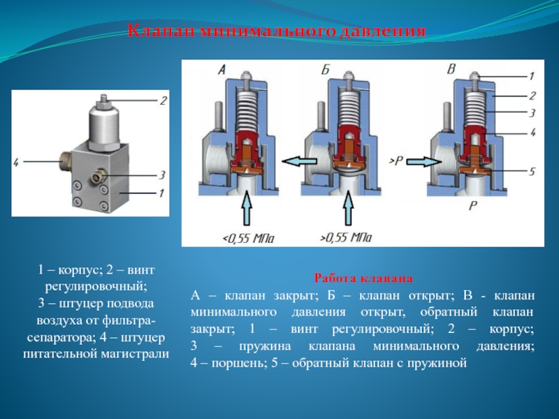 А – клапан закрыт; Б – клапан открыт; В - клапан минимального давления открыт, обратный клапан закрыт; 1 – винт регулировочный; 2 – корпус; 3 – пружина клапана минимального давления; 4 – поршень; 5 – обратный клапан с пружиной
