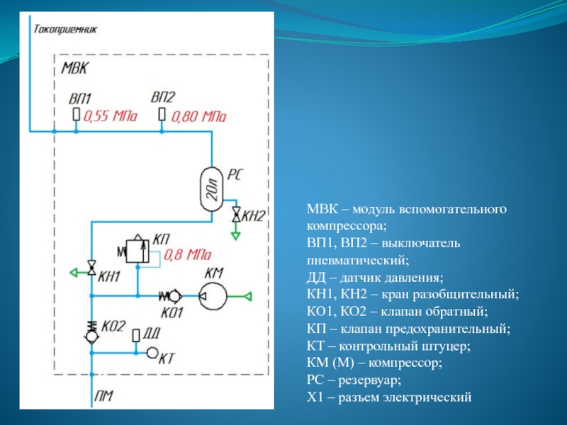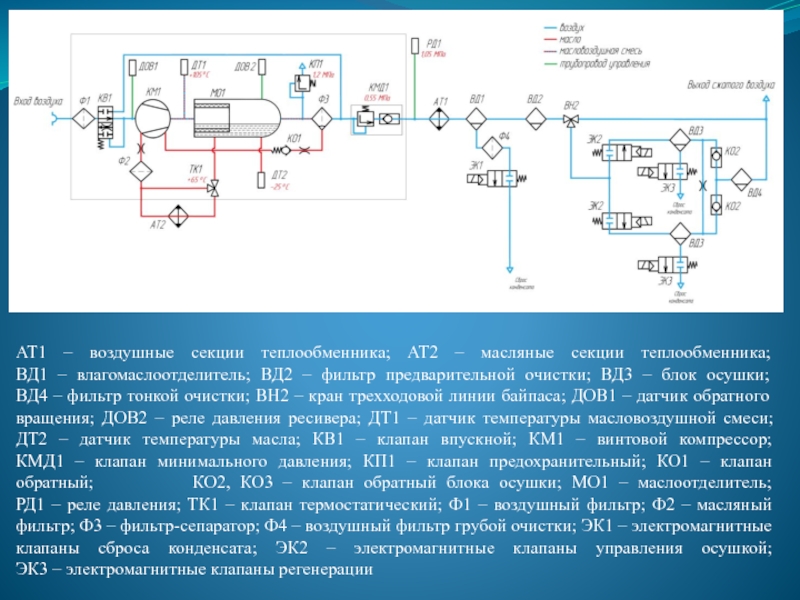 ВД1 – влагомаслоотделитель; ВД2 – фильтр предварительной очистки; ВД3 – блок осушки; ВД4 – фильтр тонкой очистки; ВН2 – кран трехходовой линии байпаса; ДОВ1 – датчик обратного вращения; ДОВ2 – реле давления ресивера; ДТ1 – датчик температуры масловоздушной смеси; ДТ2 – датчик температуры масла; КВ1 – клапан впускной; КМ1 – винтовой компрессор; КМД1 – клапан минимального давления; КП1 – клапан предохранительный; КО1 – клапан обратный; КО2, КО3 – клапан обратный блока осушки; МО1 – маслоотделитель; РД1 – реле давления; ТК1 – клапан термостатический; Ф1 – воздушный фильтр; Ф2 – масляный фильтр; Ф3 – фильтр-сепаратор; Ф4 – воздушный фильтр грубой очистки; ЭК1 – электромагнитные клапаны сброса конденсата; ЭК2 – электромагнитные клапаны управления осушкой; ЭК3 – электромагнитные клапаны регенерации