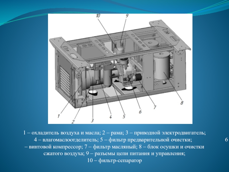 приводной электродвигатель; 4 – влагомаслоотделитель; 5 – фильтр предварительной очистки; 6 – винтовой компрессор; 7 – фильтр масляный; 8 – блок осушки и очистки сжатого воздуха; 9 – разъемы цепи питания и управления;