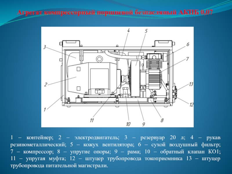 Слайд 261 – контейнер; 2 – электродвигатель; 3 – резервуар 20 л;