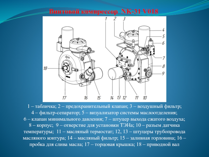 – воздушный фильтр; 4 – фильтр-сепаратор; 5 – визуализатор системы маслоотделения; 6 – клапан минимального давления; 7 – штуцер выхода сжатого воздуха; 8 – корпус; 9 – отверстие для установки ТЭНа; 10 – разъем датчика температуры; 11 – масляный термостат; 12, 13 – штуцеры трубопровода масляного контура; 14 – масляный фильтр; 15 – заливная горловина; 16 – пробка для слива масла; 17 – торцовая крышка; 18 – приводной вал