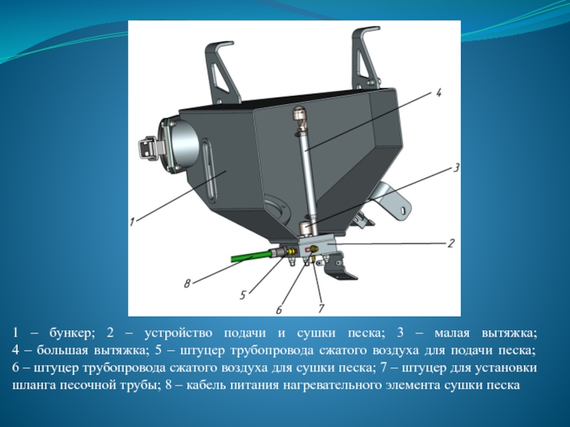 – малая вытяжка; 4 – большая вытяжка; 5 – штуцер трубопровода сжатого воздуха для подачи песка; 6 – штуцер трубопровода сжатого воздуха для сушки песка; 7 – штуцер для установки шланга песочной трубы; 8 – кабель питания нагревательного элемента сушки песка
