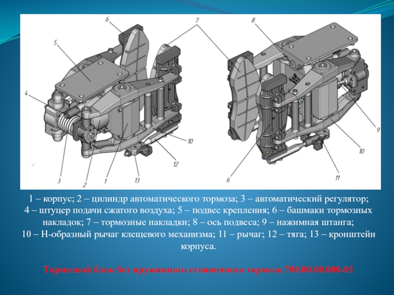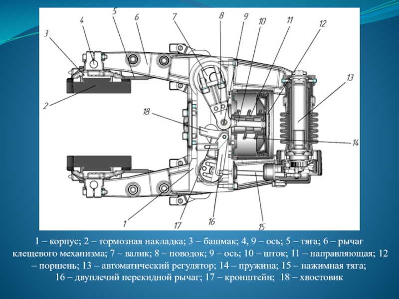 регулятор; 4 – штуцер подачи сжатого воздуха; 5 – подвес крепления; 6 – башмаки тормозных накладок; 7 – тормозные накладки; 8 – ось подвеса; 9 – нажимная штанга; 10 – Н-образный рычаг клещевого механизма; 11 – рычаг; 12 – тяга; 13 – кронштейн корпуса.