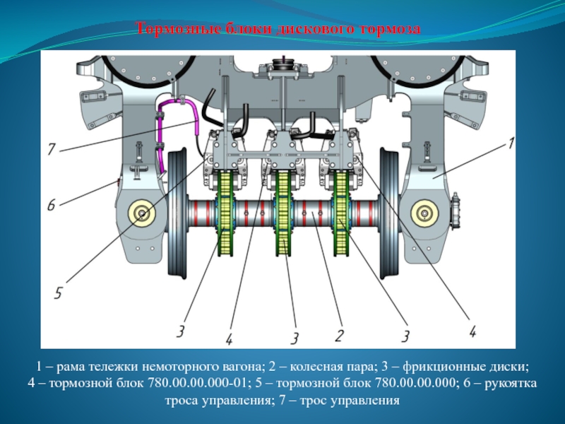 колесная пара; 3 – фрикционные диски; 4 – тормозной блок 780.00.00.000-01; 5 – тормозной блок 780.00.00.000; 6 – рукоятка троса управления; 7 – трос управления