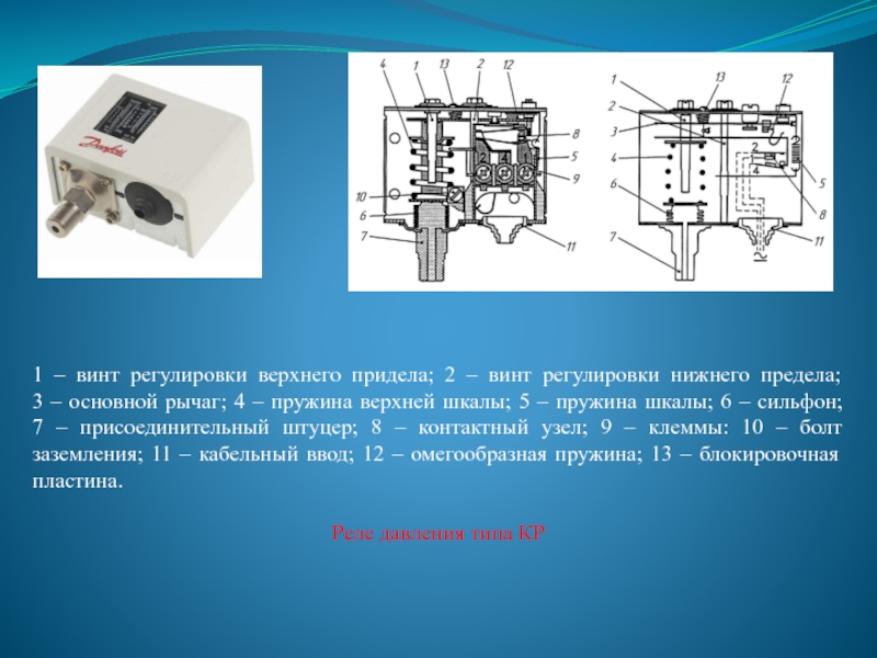 предела; 3 – основной рычаг; 4 – пружина верхней шкалы; 5 – пружина шкалы; 6 – сильфон; 7 – присоединительный штуцер; 8 – контактный узел; 9 – клеммы: 10 – болт заземления; 11 – кабельный ввод; 12 – омегообразная пружина; 13 – блокировочная пластина.