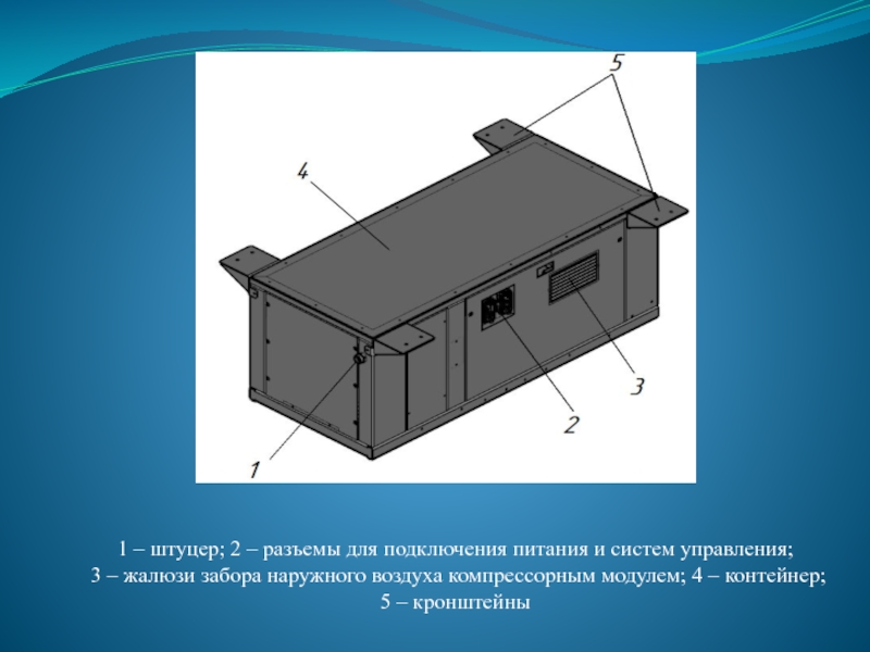 управления; 3 – жалюзи забора наружного воздуха компрессорным модулем; 4 – контейнер; 5 – кронштейны