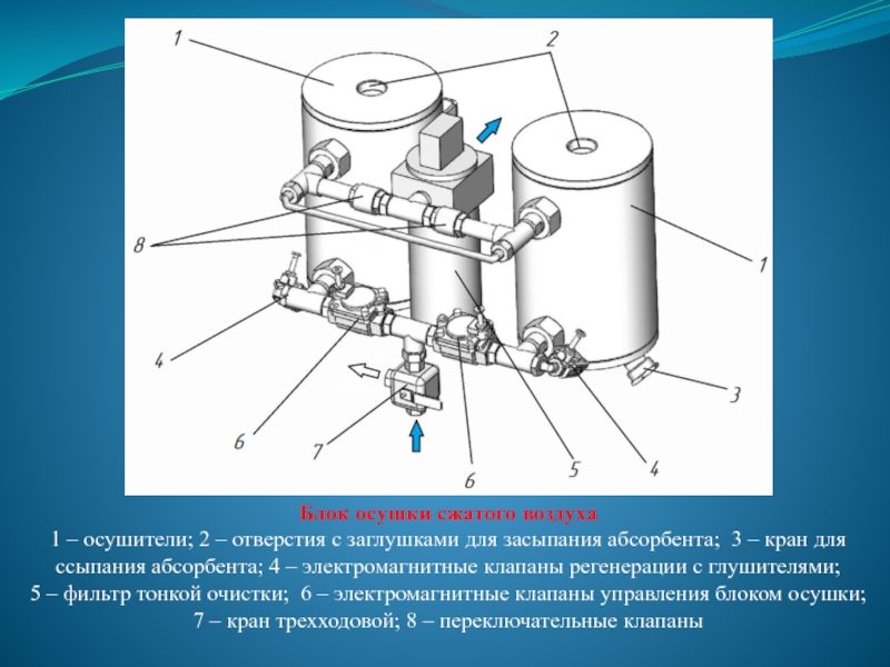 заглушками для засыпания абсорбента; 3 – кран для ссыпания абсорбента; 4 – электромагнитные клапаны регенерации с глушителями; 5 – фильтр тонкой очистки; 6 – электромагнитные клапаны управления блоком осушки; 7 – кран трехходовой; 8 – переключательные клапаны