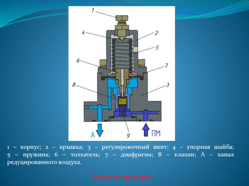 – кольцо уплотнительное; 3 – поршень; 4 – шток; 5 – пружина; 6 – регулировочная гайка; 7 – крышка: 8 – номерная табличка; 9 – пломба.