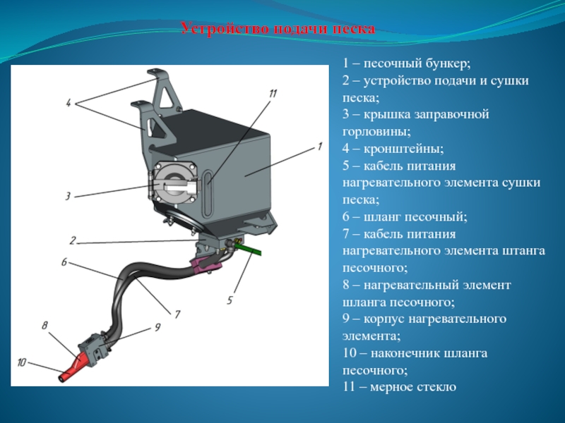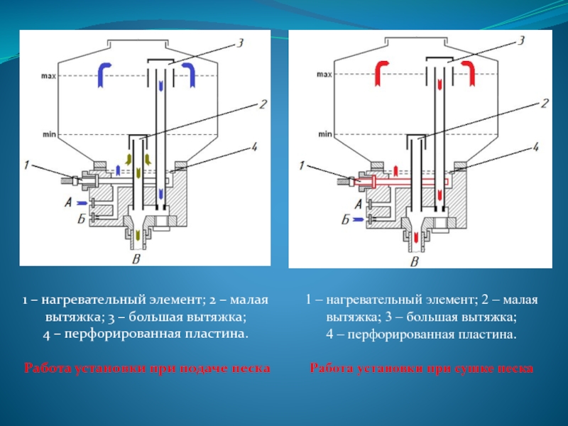 Слайд 951 – бункер; 2 – устройство подачи и сушки песка; 3