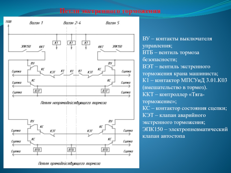 - петля экстренного торможения – экстренное торможение автоматических пневматических тормозов непрямодействующего типа или электропневматических тормозов прямодействующего типа при разрыве одной из петель экстренного торможения (петля экстренного торможения - последовательное соединение аппаратов всего электропоезда (сдвоенных поездов) в общую электрическую цепь, замкнутую в нормальном режиме, целостность которой контролируется системой управления);