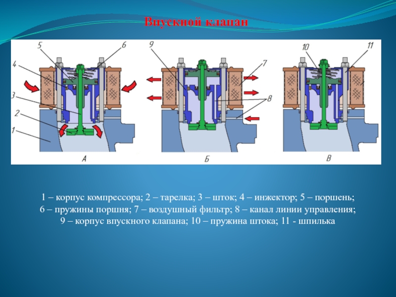 4 – инжектор; 5 – поршень; 6 – пружины поршня; 7 – воздушный фильтр; 8 – канал линии управления; 9 – корпус впускного клапана; 10 – пружина штока; 11 - шпилька