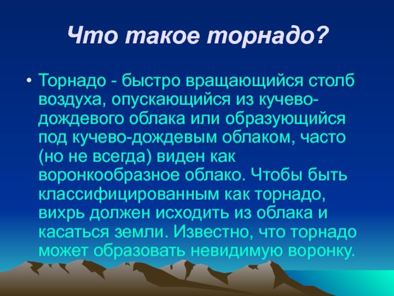 облака или образующийся под кучево-дождевым облаком, часто (но не всегда) виден как воронкообразное облако. Чтобы быть классифицированным как торнадо, вихрь должен исходить из облака и касаться земли. Известно, что торнадо может образовать невидимую воронку.