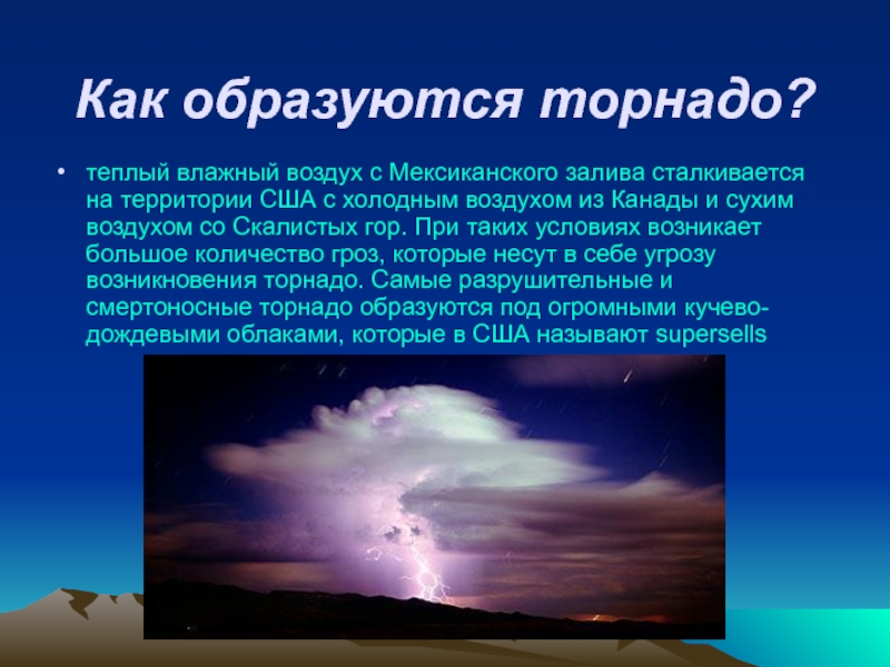 США с холодным воздухом из Канады и сухим воздухом со Скалистых гор. При таких условиях возникает большое количество гроз, которые несут в себе угрозу возникновения торнадо. Самые разрушительные и смертоносные торнадо образуются под огромными кучево-дождевыми облаками, которые в США называют supersells