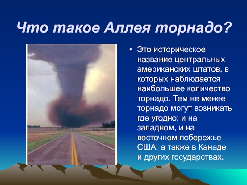 наблюдается наибольшее количество торнадо. Тем не менее торнадо могут возникать где угодно: и на западном, и на восточном побережье США, а также в Канаде и других государствах.