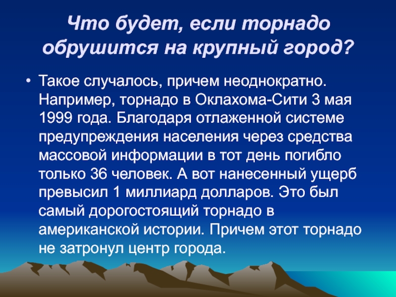 Слайд 14Что будет, если торнадо обрушится на крупный город?