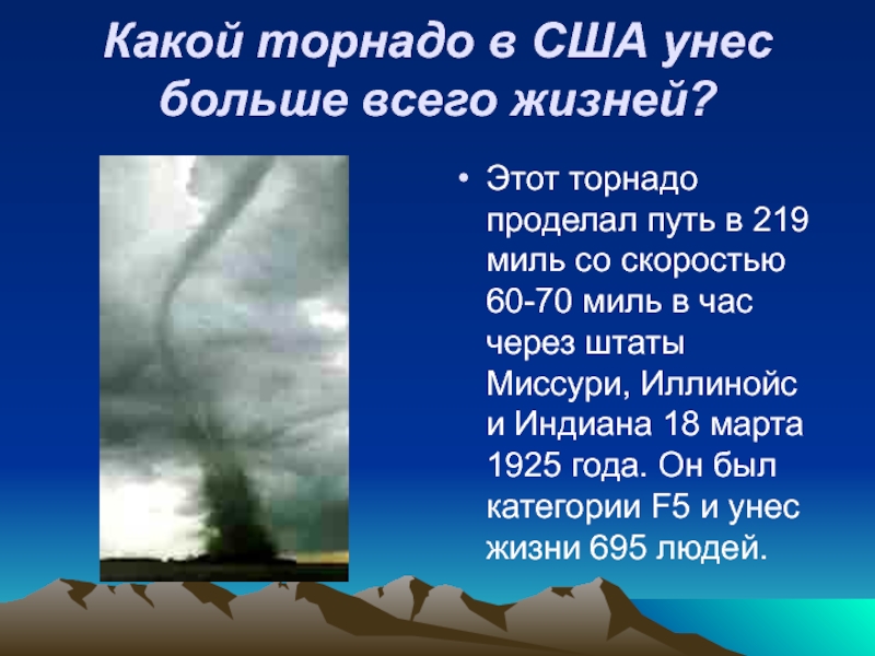Слайд 10Какой торнадо в США унес больше всего жизней?