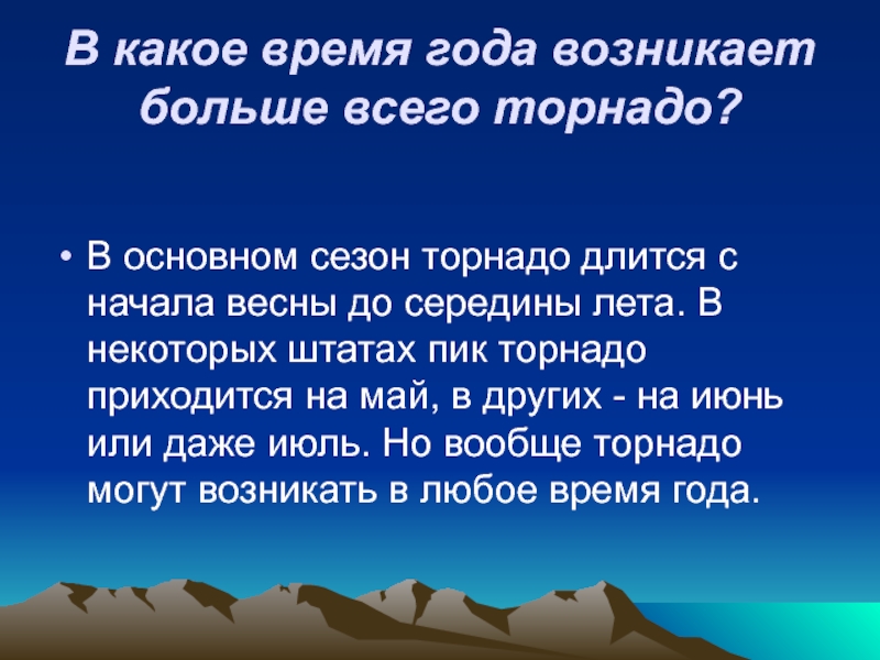 длится с начала весны до середины лета. В некоторых штатах пик торнадо приходится на май, в других - на июнь или даже июль. Но вообще торнадо могут возникать в любое время года.