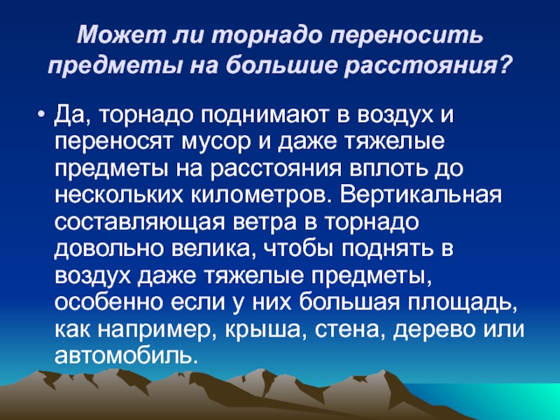 воздух и переносят мусор и даже тяжелые предметы на расстояния вплоть до нескольких километров. Вертикальная составляющая ветра в торнадо довольно велика, чтобы поднять в воздух даже тяжелые предметы, особенно если у них большая площадь, как например, крыша, стена, дерево или автомобиль.
