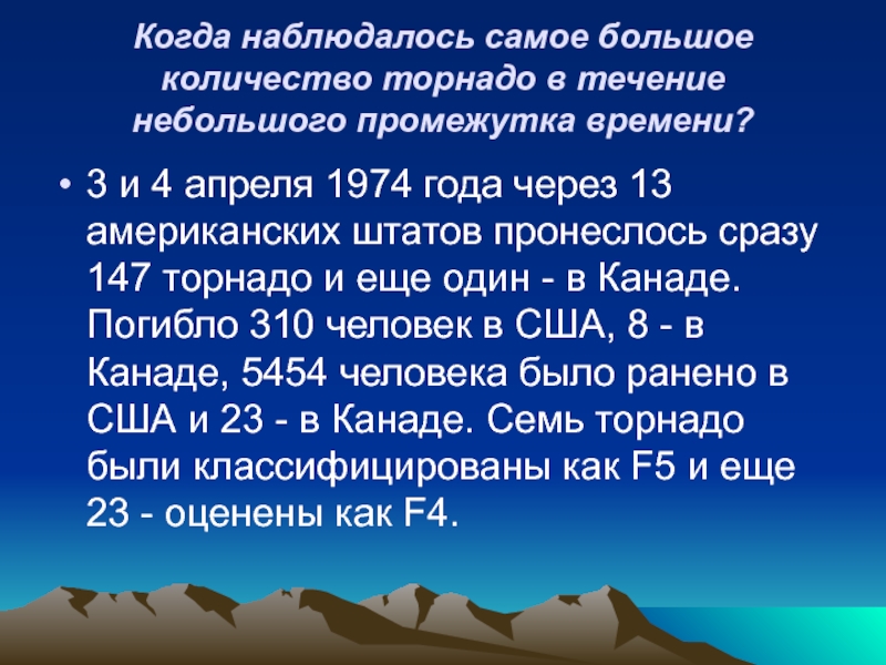 Слайд 12Когда наблюдалось самое большое количество торнадо в течение небольшого промежутка времени?