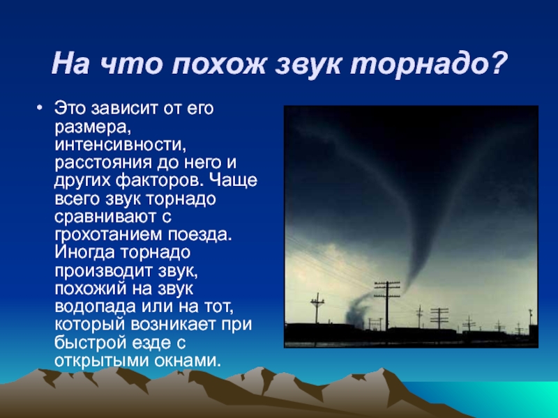 до него и других факторов. Чаще всего звук торнадо сравнивают с грохотанием поезда. Иногда торнадо производит звук, похожий на звук водопада или на тот, который возникает при быстрой езде с открытыми окнами.