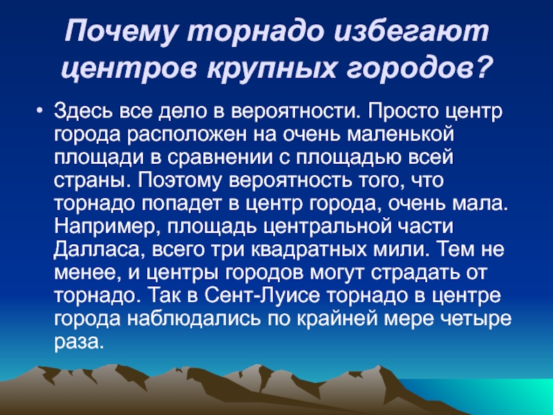 центр города расположен на очень маленькой площади в сравнении с площадью всей страны. Поэтому вероятность того, что торнадо попадет в центр города, очень мала. Например, площадь центральной части Далласа, всего три квадратных мили. Тем не менее, и центры городов могут страдать от торнадо. Так в Сент-Луисе торнадо в центре города наблюдались по крайней мере четыре раза.