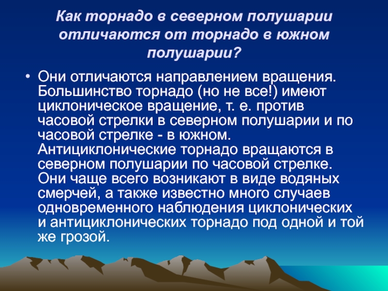Слайд 6Как торнадо в северном полушарии отличаются от торнадо в южном полушарии?