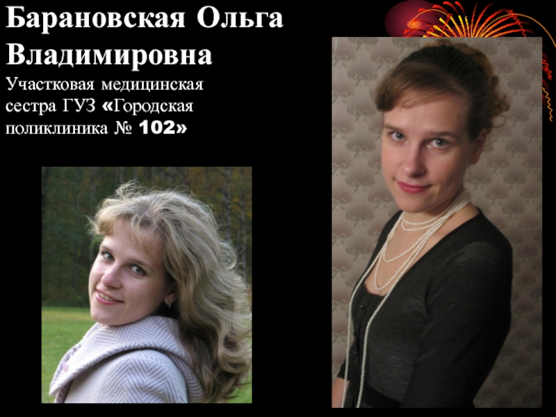 Слайд 6Барановская Ольга Владимировна Участковая медицинская сестра ГУЗ «Городская поликлиника № 102»