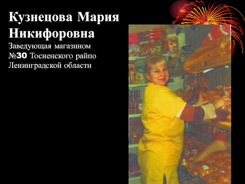 Слайд 9Кузнецова Мария Никифоровна Заведующая магазином №30 Тосненского райпо Ленинградской области