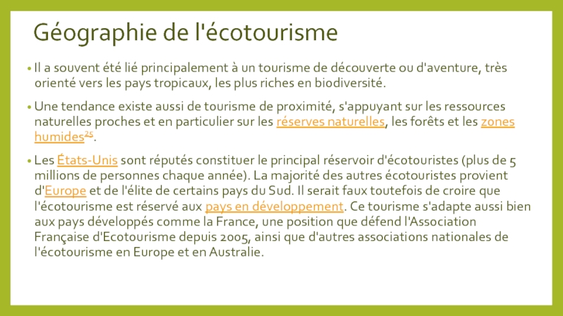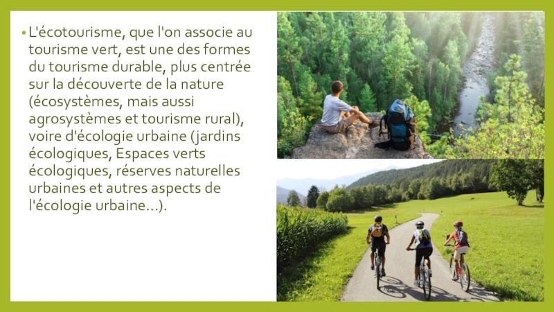 du tourisme durable, plus centrée sur la découverte de la nature (écosystèmes, mais aussi agrosystèmes et tourisme rural), voire d'écologie urbaine (jardins écologiques, Espaces verts écologiques, réserves naturelles urbaines et autres aspects de l'écologie urbaine...).