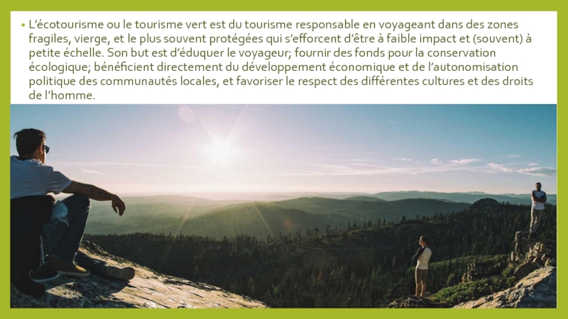 dans des zones fragiles, vierge, et le plus souvent protégées qui s’efforcent d’être à faible impact et (souvent) à petite échelle. Son but est d’éduquer le voyageur; fournir des fonds pour la conservation écologique; bénéficient directement du développement économique et de l’autonomisation politique des communautés locales, et favoriser le respect des différentes cultures et des droits de l’homme.