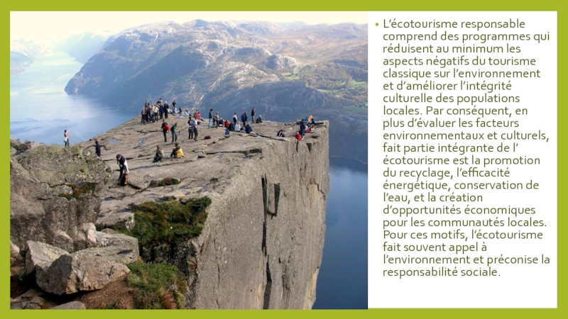 négatifs du tourisme classique sur l’environnement et d’améliorer l’intégrité culturelle des populations locales. Par conséquent, en plus d’évaluer les facteurs environnementaux et culturels, fait partie intégrante de l’écotourisme est la promotion du recyclage, l’efficacité énergétique, conservation de l’eau, et la création d’opportunités économiques pour les communautés locales. Pour ces motifs, l’écotourisme fait souvent appel à l’environnement et préconise la responsabilité sociale.
