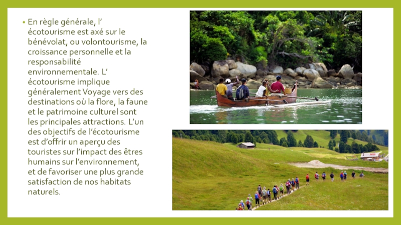 L'écotourisme, que l'on associe au tourisme vert, est une des formes