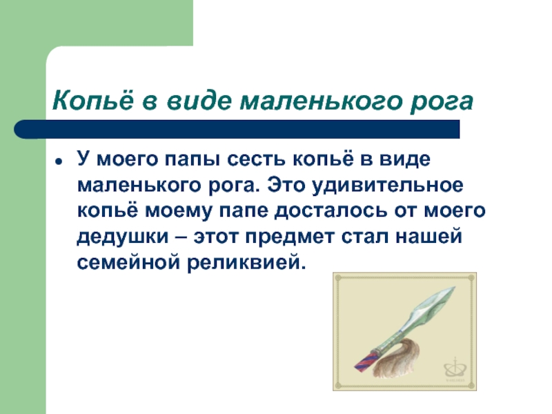 виде маленького рога. Это удивительное копьё моему папе досталось от моего дедушки – этот предмет стал нашей семейной реликвией.
