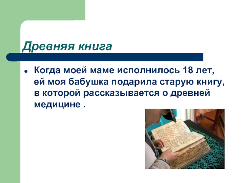 подарила старую книгу, в которой рассказывается о древней медицине .