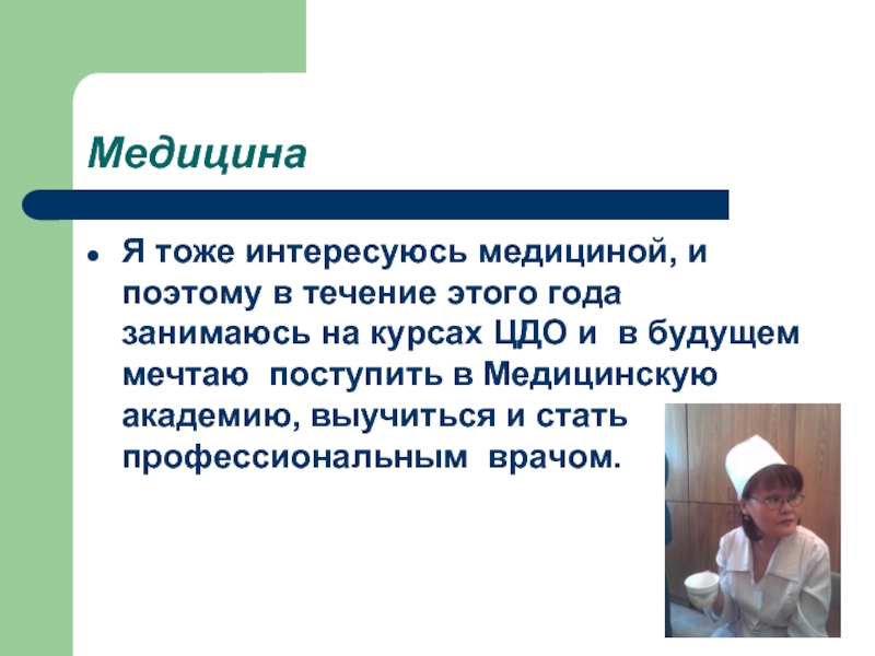 занимаюсь на курсах ЦДО и в будущем мечтаю поступить в Медицинскую академию, выучиться и стать профессиональным врачом.