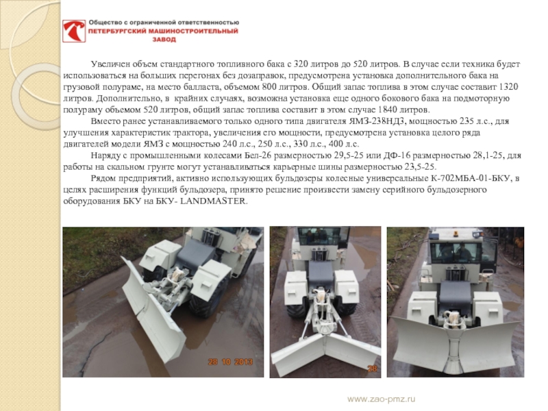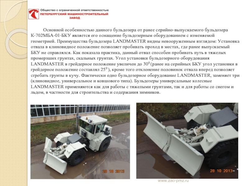2. Бульдозер колесный универсальный К-702-МБА-01-БКУ-LANDMASTER. При проектировании данного бульдозера был применен опыт производства армейских БАТов (Бульдозеров на артиллерийском тягаче).