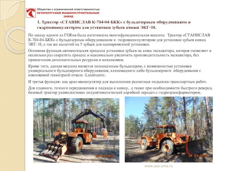 По заказу одного из ГОКов была изготовлена многофункциональная машина: Трактор «СТАНИСЛАВ К-704-04-БКК» с бульдозерным оборудованием и гидроманипулятором для установки зубьев ковша ЭКГ-10, а так же кассетой на 5 зубьев для одновременной установки.