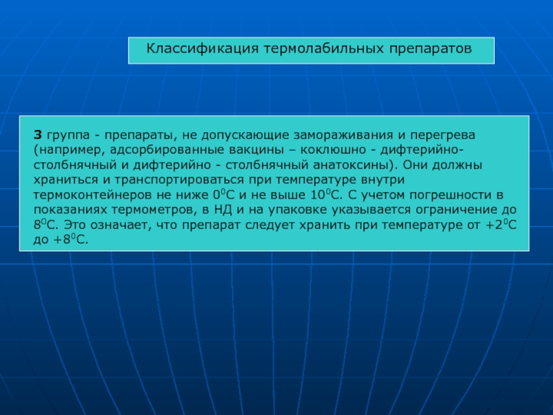 2 группа - препараты, которые нельзя замораживать. Их хранят и транспортируют только при положительной температуре. Нижняя граница - 00С, верхняя может достигать 300С. Эти препараты можно хранить и транспортировать при температурах, близких к комнатной. Требование к температуре «не выше 300C» означает, что температура хранения от +20С до +300С.